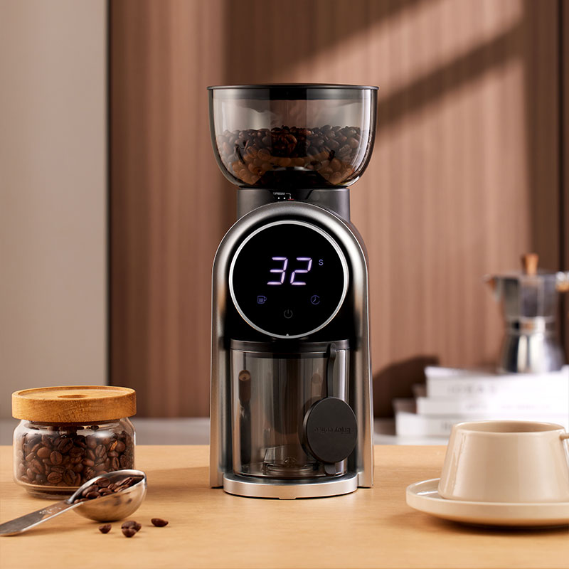 مطحنة القهوة المخروطية بسعة 250 جرام من حبوب القهوة، زر واحد للتحكم، يجعل حياة القهوة أكثر سهولة ومتعة، زر واحد لضبط فناجين القهوة، زر واحد لضبط وقت الطحن، 25 إعدادًا من الخشن إلى النعومة. يمكنها تلبية احتياجات مسحوق قهوة الإسبريسو ومسحوق قهوة موكا ومسحوق القهوة التركية ومسحوق القهوة المصب.